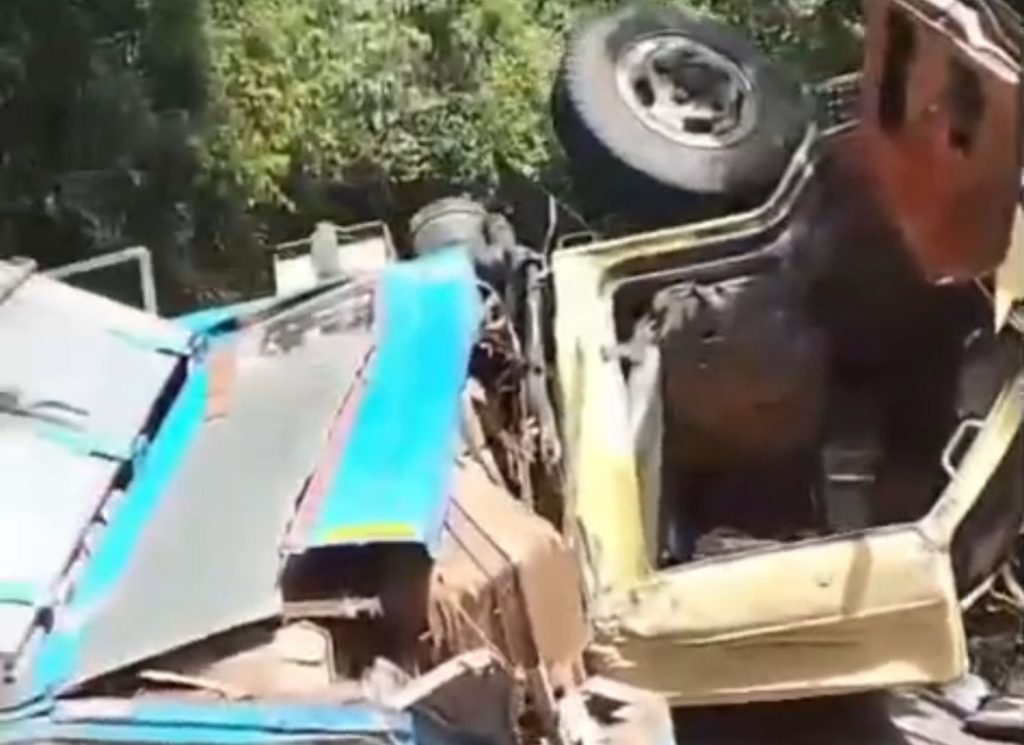 Dalam rekaman video yang diterima redaksi, terlihat kondisi truk mengalami kerusakan parah. Bagian kabin depan ringsek, sementara box belakang penyok dan terbuka akibat benturan keras.